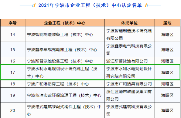 發(fā)布日期:2022.09.15 近日,寧波市發(fā)展和改革委員會、寧波市經(jīng)濟和信息化局、寧波市財政局、寧波市科學技術(shù)局聯(lián)合發(fā)文,公布2021年寧波市企業(yè)工程(技術(shù))中心認定名單。我院為主體申報的“寧波水利水電... -