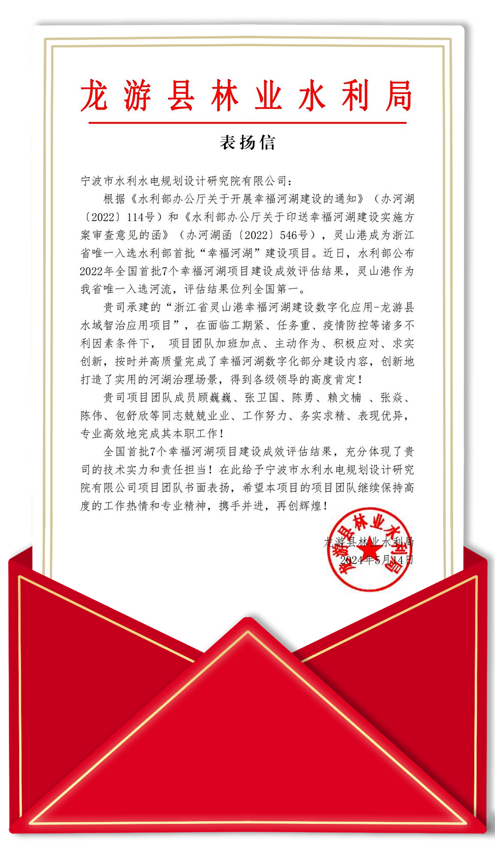 為寧波市水利院點贊——一封來自寧波市水利局水旱災(zāi)害防御處的感謝信