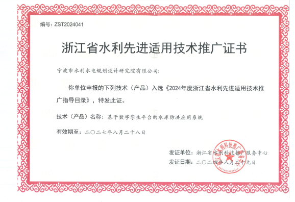 在產品創(chuàng)新方面,分別獲得第三屆寧波市專利創(chuàng)新大賽專利優(yōu)秀獎、“寧波市優(yōu)秀軟件產品”稱號、2024年“數(shù)據(jù)要素x”大賽浙江分賽獲優(yōu)勝獎,入選2024年度浙江省水利先進適用技術推廣指導目錄、2024年度寧波市優(yōu)質產品推薦目錄和2024年浙江省數(shù)字經濟發(fā)展優(yōu)秀案例近20項。
