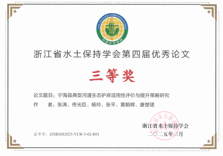 會議現(xiàn)場通報了2024年度生產(chǎn)建設(shè)項目水土保持方案優(yōu)秀單位、2024年度生產(chǎn)建設(shè)項目水土保持監(jiān)測優(yōu)秀單位,并為獲獎集體進行表彰。隨后,又現(xiàn)場表彰了浙江省水土保持學(xué)會第四屆優(yōu)秀論文評選結(jié)果。我院榮獲2024年度生產(chǎn)建設(shè)項目水土保持方案優(yōu)秀單位、2024年度生產(chǎn)建設(shè)項目水土保持監(jiān)測優(yōu)秀單位兩項集體榮譽,并且以論文《寧??h典型河道生態(tài)護岸適用性評價與提升策略研究》獲得浙江省水土保持學(xué)會第四屆優(yōu)秀論文三等獎。