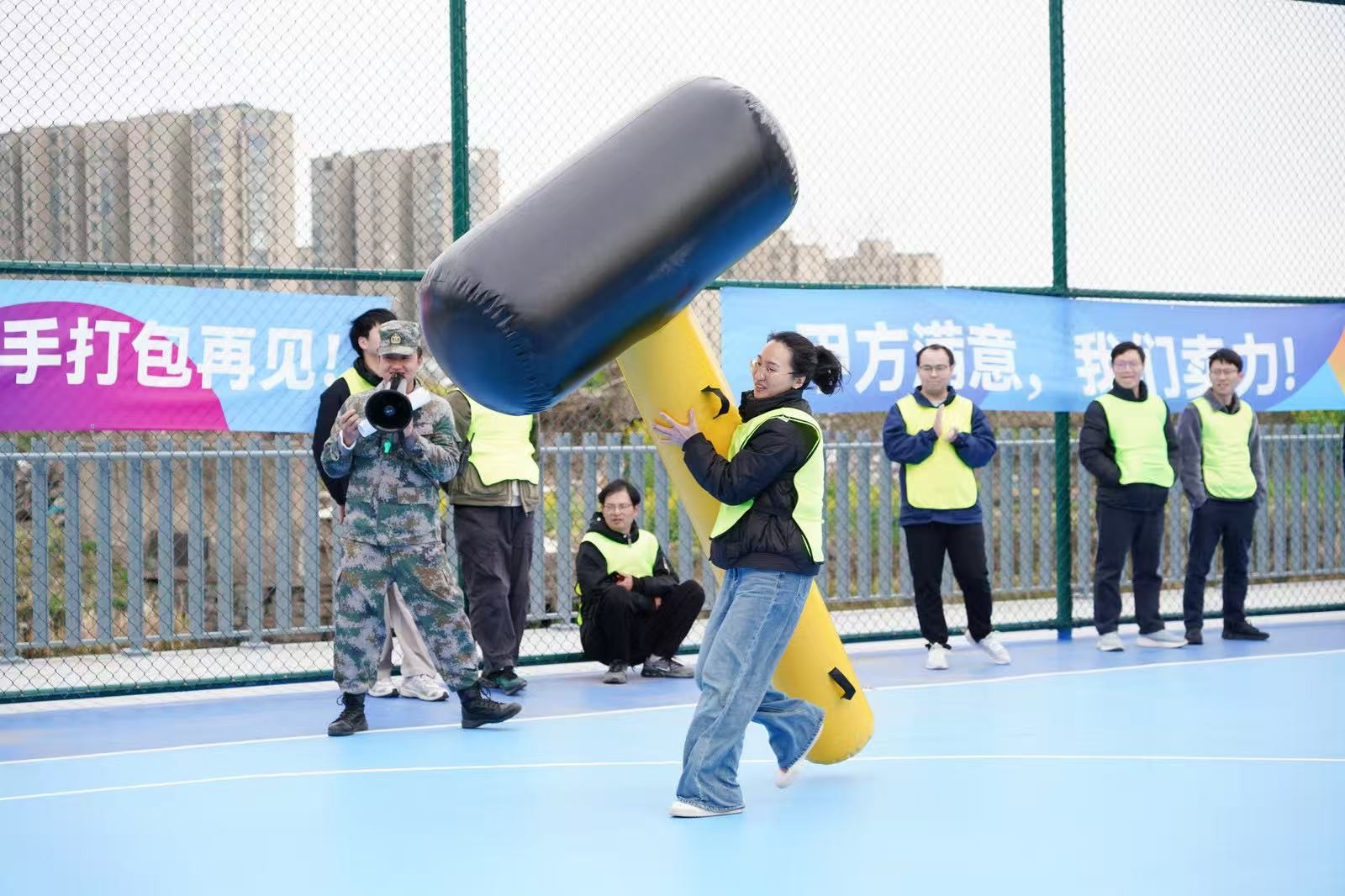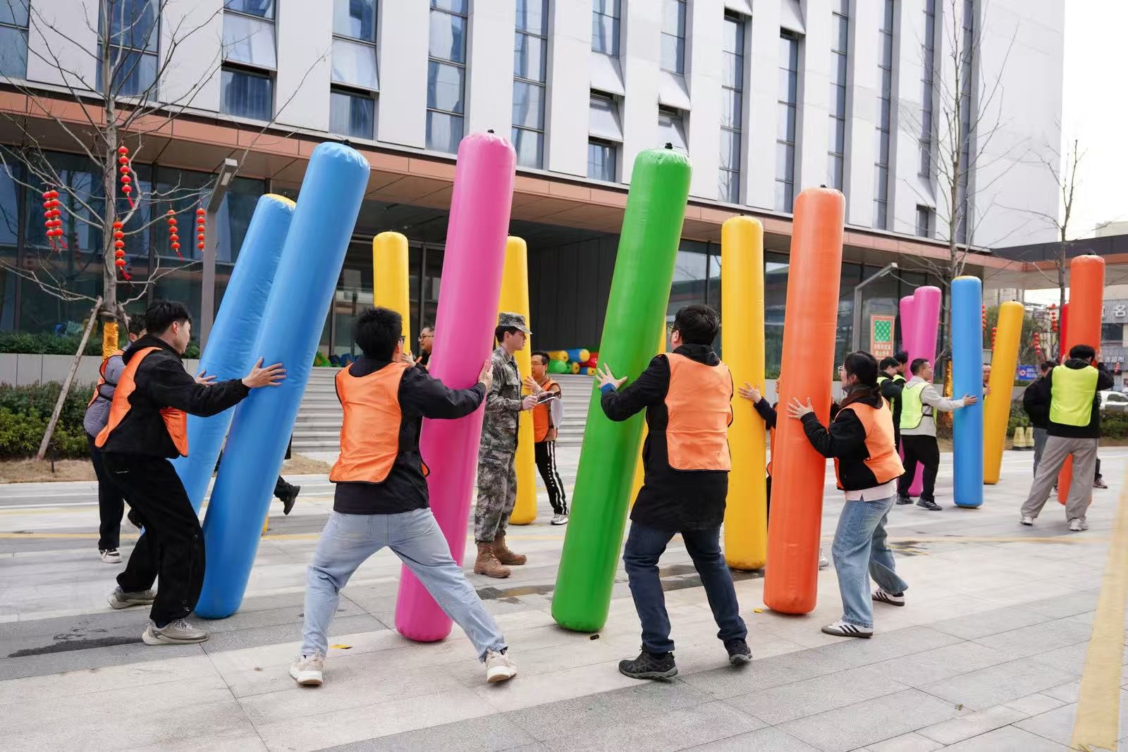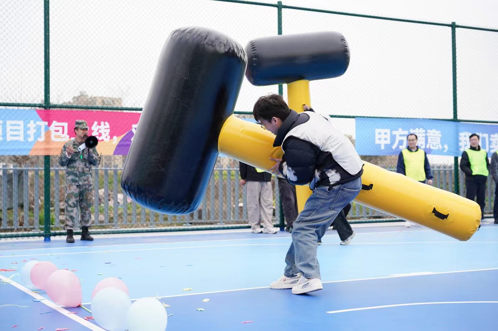 在“南水北調(diào)”項(xiàng)目中,隊(duì)員們手持PVC管接力運(yùn)水,5分鐘內(nèi)爭分奪秒,讓水流在管中傳遞涌向重點(diǎn),仿佛將團(tuán)隊(duì)的信任與責(zé)任匯聚成河。“龜兔賽跑”則讓隊(duì)員們化身可愛的“烏龜”和“兔子”,在賽道上你追我趕,妙趣橫生。“鴻運(yùn)亨通”需要8人共同托舉大球折返跑,大家步調(diào)一致,齊頭并進(jìn)。“一錘定音”環(huán)節(jié),隊(duì)員們揮動充氣大錘敲破氣球,每一聲“砰”響都引來陣陣喝彩。