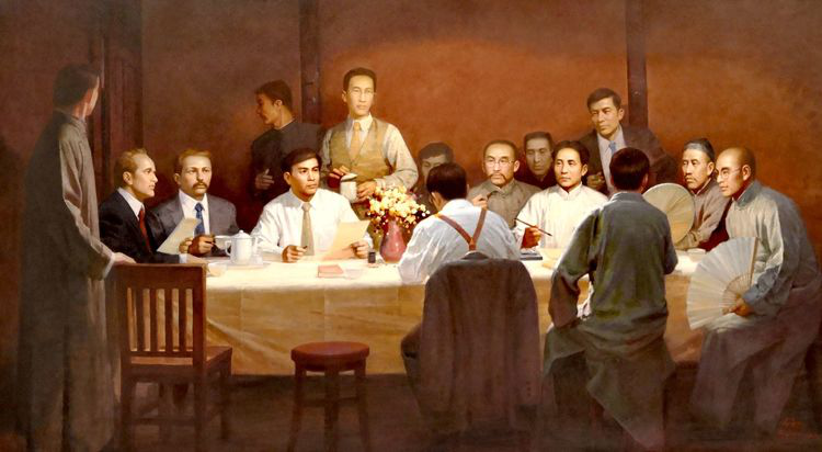 7月23日晚,中國共產(chǎn)黨第一次全國代表大會(huì)在上海法租界望志路106號(hào)(今興業(yè)路76號(hào))正式開幕。會(huì)址設(shè)在李書城、李漢俊兄弟住宅,大家圍坐在客廳長(zhǎng)餐桌四周,室內(nèi)沒有特別布置,陳設(shè)簡(jiǎn)單,氣氛莊重。出席者有上海的李漢俊、李達(dá);北京的張國燾、劉仁靜;長(zhǎng)沙的毛澤東、何叔衡;武漢的董必武、陳潭秋;濟(jì)南的王盡美、鄧恩銘;廣州的陳公博;留日學(xué)生周佛海以及陳獨(dú)秀委派的包惠僧。陳獨(dú)秀和李大釗因公務(wù)在身未出席會(huì)議,而在代表們心目中他們?nèi)允屈h的主要?jiǎng)?chuàng)始人和領(lǐng)袖。