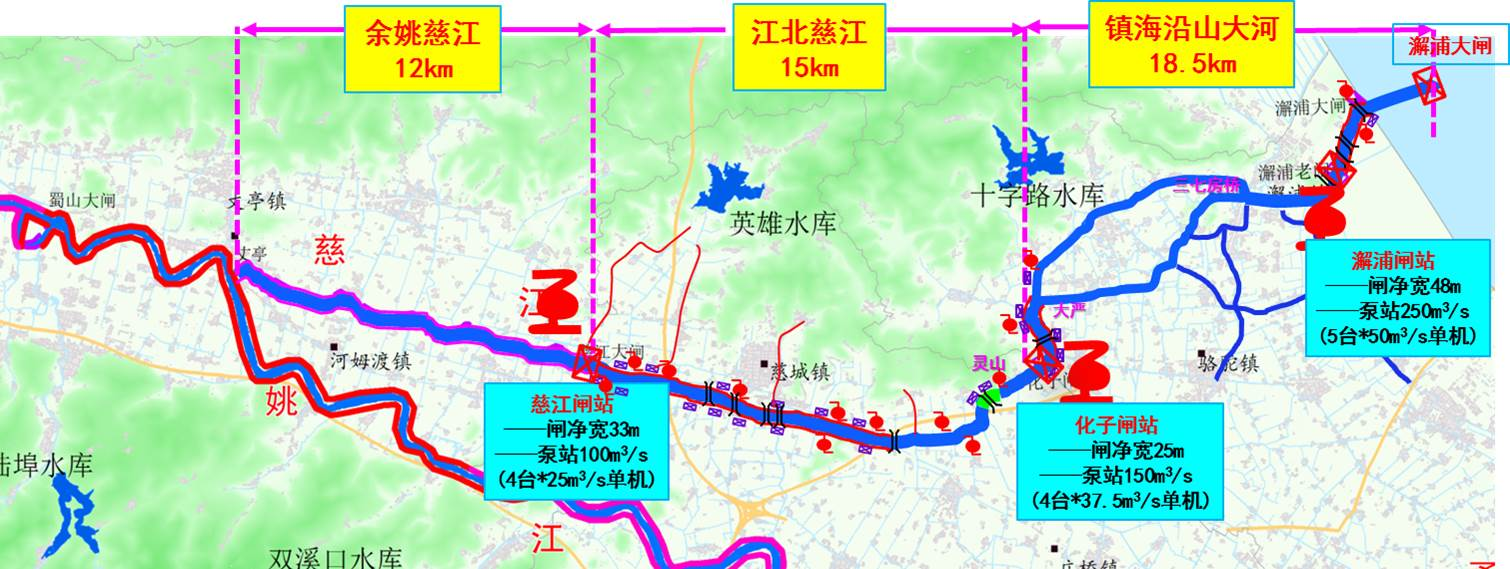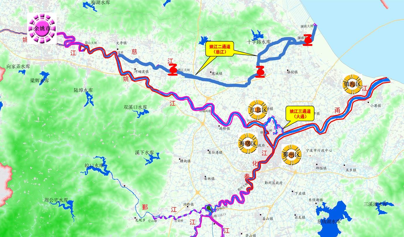 姚江東排工程(即姚江二通道(慈江)工程)西起慈江大閘,經(jīng)江北、鎮(zhèn)海沿山大河,自西向東由澥浦大閘外排入杭州灣,工程全長(zhǎng)約34km,研究為有效克服土地、資金、工期等一系列要素制約問(wèn)題,創(chuàng)新性引入“高速水路———梯級(jí)泵站排水”設(shè)計(jì)理念,切實(shí)解決了濱海平原地區(qū)自流排水易受外海潮位頂托和河道輸水流速低、排水慢等問(wèn)題,該方案于2015年11月經(jīng)寧波市人民政府第70次常委會(huì)議審議通過(guò),并納入省委省政府、市委市政府確定的姚江奉化江流域洪澇治理“6+1”工程。