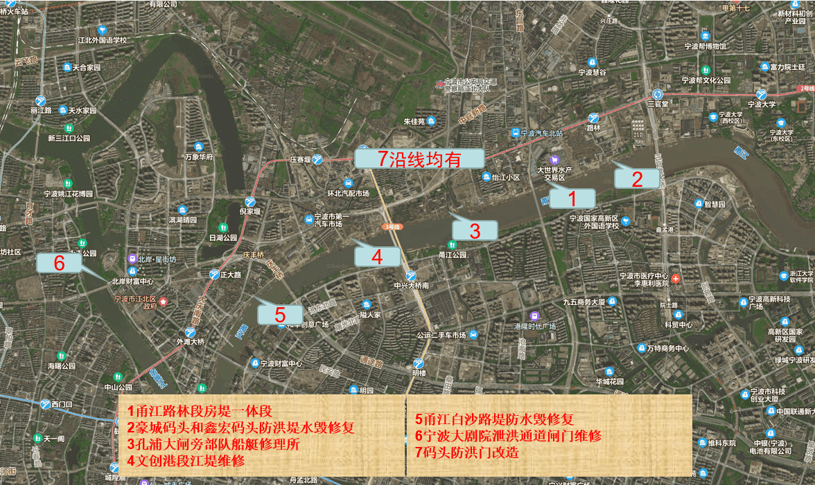 本工程建設(shè)內(nèi)容包括甬江路林段房堤一體段、豪城碼頭和鑫宏碼頭防洪堤水毀修復(fù);孔浦大閘旁部隊(duì)船艇修理所、文創(chuàng)港段江堤維修;甬江白沙路堤防水毀修復(fù);寧波大劇院泄洪通道閘門維修;碼頭防洪門改造等水毀修復(fù)水利工作。