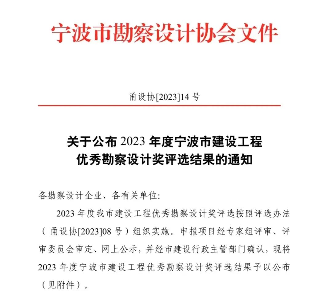 喜報(bào) | 我院兩大項(xiàng)目榮獲2023年度寧波市優(yōu)秀勘察設(shè)計(jì)獎(jiǎng)!